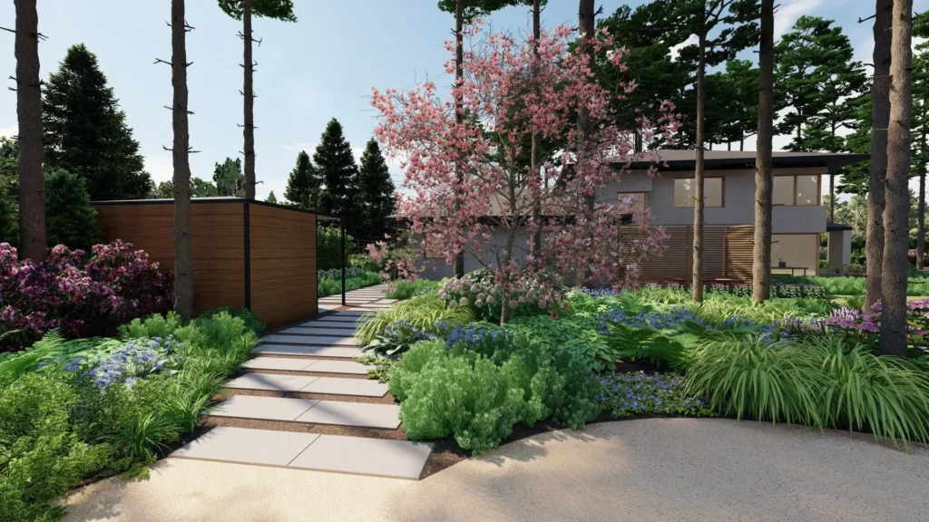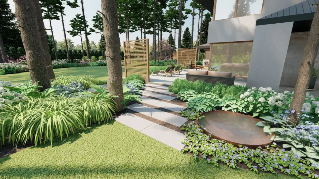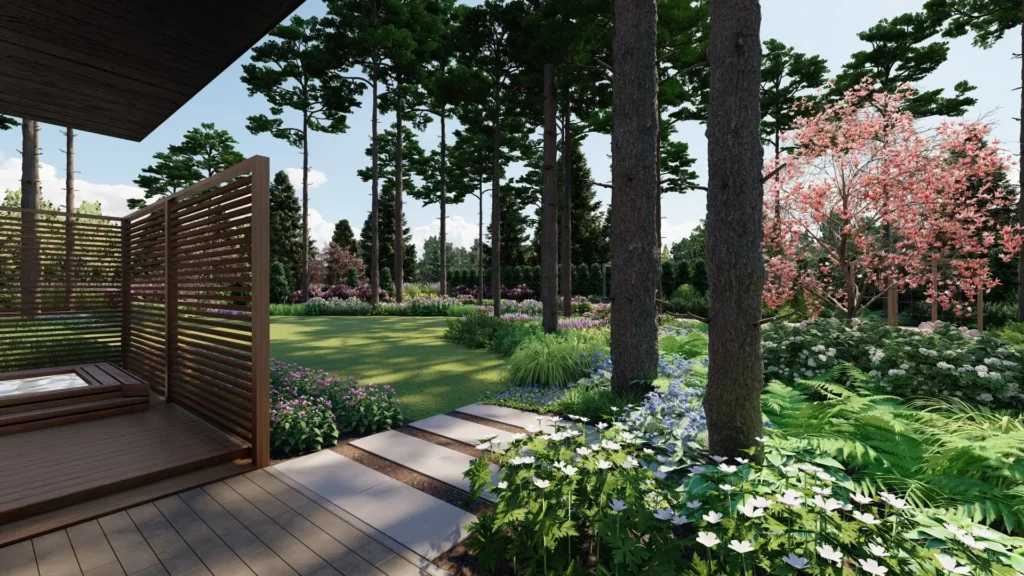 Efektem jest ogród elegancki, spokojny i nastrojowy – naturalna przestrzeń wypoczynku wśród drzew.